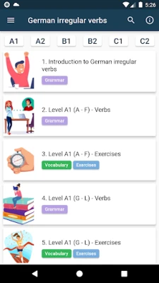 In this application you will find over 200 irregular German verbs with translation, audio pronunciation and forms in Präsens, Imperfekt and Perfekt as well as an auxiliary verb for the German Perfekt tense. The application contains over 600 example sentences with translation into English - you will see the use of each verb on example sentences in three different tenses. The learning material is divided into 56 subchapters, which correspond to particular levels of language proficiency. The verbs are divided by levels (from A1 to C2). The division of verbs in levels A1, A2, B1 corresponds to the requirements of the Goethe-Institut. The verbs in levels B2, C1, C2 are divided according to our own broad experience. German Irregular Verbs is an application for every level of language proficiency.
