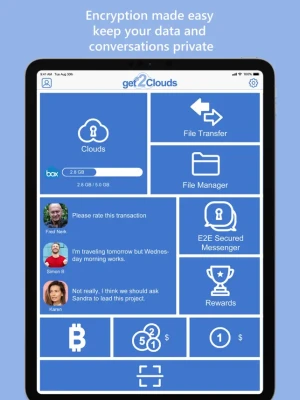 • SEND LARGE FILES FREE: Fast, encrypted file transfers of unlimited size on the go. Transfer photos, videos, documents, voice messages all within the secure bubble of get2Clouds. No size limit.