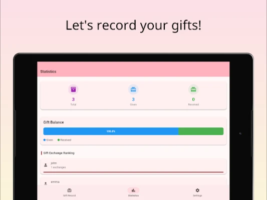 An all-in-one gift tracking app that lets you see what you gave and received at a glance. Add photos and notes to preserve your special memories.Ever forgotten about important gift exchanges? GiftLog helps you easily record what you gave to whom and what you received from others.