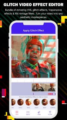 Just a tap, choose one from multi Real-time glitch effects and hold to apply it in video recording. Besides, massive unique VHS, 3d vaporwave effects, retro filters and editing tools make your clip even sparkle.