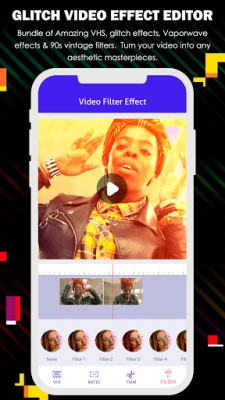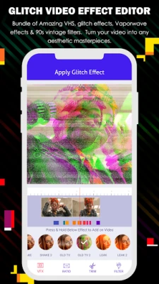 You can easy make cool effect Vaporwave video effect, VHS effect, ranging from RGB glitches, VHS, trippy, sketch, grainy, pixelated filters, retro 3d video effects.