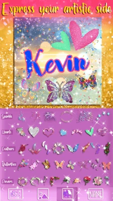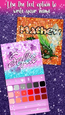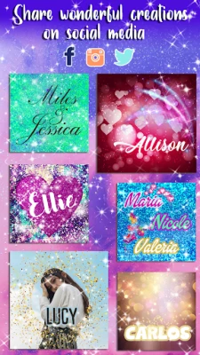 With Glitter Name Art Maker, users can easily share their designs with friends and family. Pick from cute photo stickers with effects & have fun. Write on background in this pic editor. Post shine name art picture on social media as story or status. Share glitter name art wallpaper with friends and followers. Glitter colour name and image editor for girls and boys is photo creator. The user-friendly interface of the Glitter Name Art Maker makes it easy for users to create stunning designs. It's a “name art” for picture editing.