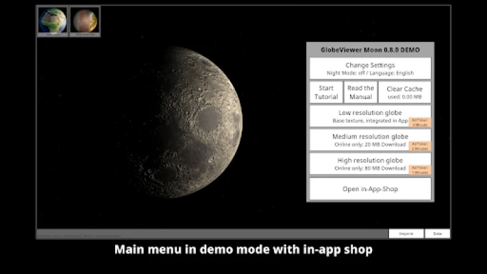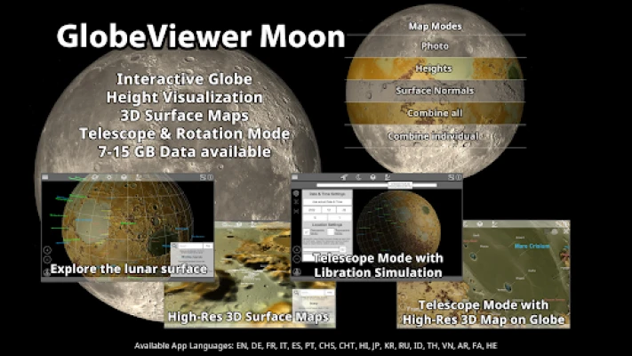 There are four map modes available (elevation display, photo illustration, a combination of both and a grey texture for the telescope mode). These views were created from data from NASA's Lunar Reconnaissance Orbiter. In addition, surface details (normal maps) have been obtained from the elevation data for the display, which can be combined with all map modes. Even the smallest craters, elevations, grooves and gorges are visible on the map.