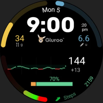When paired with the Gluroo mobile app (https://play.google.com/store/apps/details?id=com.gluroo.app), this watchface's complications show real-time CGM (Continuous Glucose Monitor) information on your Wear OS 4 or 5 app. Gluroo works with Dexcom G6, G7, One, One+ and Abbott Freestyle Libre CGMs.