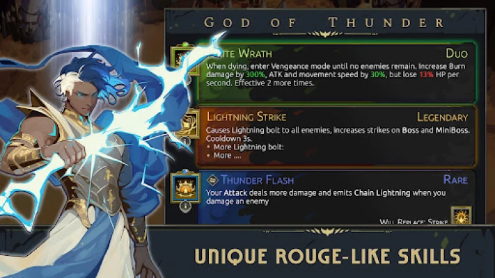 Wield the powers of elemental gods. Choose your boons—lightning strikes, glacial storms, shields of justice—and craft countless builds to dominate each run. No path is the same. Every blessing changes everything.