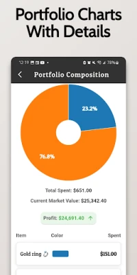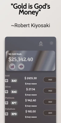 As a premier gold tracker, this app stands out in the digital realm, offering unparalleled functionality and precision. This gold tracker is designed to meet the needs of both novice and seasoned investors, making it the go-to gold tracker for monitoring the ever-fluctuating gold market. With this gold tracker, users have the ability to track gold prices in real-time, ensuring that they are always up-to-date with the latest gold prices and movements. The app's robust gold tracker features allow for detailed tracking of gold investments, from bullion to scrap metal, providing a comprehensive overview that is essential for effective portfolio management. Whether you're looking to make quick decisions based on current gold prices or planning long-term investments, this gold tracker equips you with all the necessary tools to track your gold assets efficiently. Embrace the power of this gold tracker to enhance your investment strategy, making it easier than ever to stay informed and ahead in the gold market.