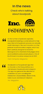 Inc. Magazine – “Goodpods is a free podcast app that is a mix between Goodreads and Instagram. The app has garnered the attention of celebrities as users including Malcolm Gladwell, Simon Sinek, Kim Kardashian, Alyssa Milano, and Katie Couric.”