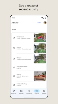 The Google Home app is designed to show you the status of your home and keep you up to date with what you may have missed. Check in on your home anytime and see a recap of recent events. You can also get a notification if something important happens while you’re away.