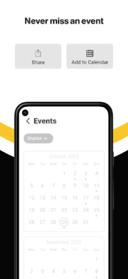 NEVER MISS AN EVENT The event section shows a list of events throughout the district. Users can add an event to their calendar to share the event with friends and family with one tap.
