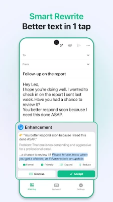 Say goodbye to awkward sentences and embarrassing grammar errors. With smart AI technology, you can instantly improve your writing quality and communicate your ideas more effectively — anytime, anywhere.