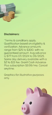 * Terms & conditions apply. Qualification based on eligibility & verification. Advance amounts range from $25 to $300, with no guaranteed amount. Average advance is $77 from 07/24 to 09/25. Same day delivery available with a $2 to $15 fee. Grant Cash Advance Plus subscription $9.99/mo. Cancel anytime. Paid endorsement. Promotions vary by eligibility; daily cash out limits apply. Redemption processing time may vary. Some offers may incur costs - see website FAQ for full terms. Graphics for illustrative purposes only. Full suite of products and services not available in CT, DC, MD, KS, NV, RI, SC, and WI. Please review Grant's Customer Agreement for further information and full terms and conditions.