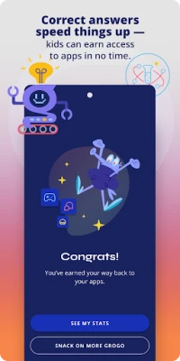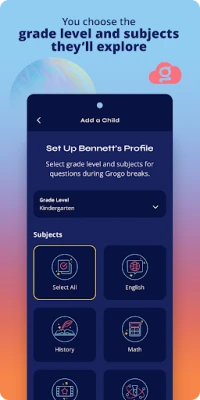 ➡️ Learning Time: To unlock their device, your child answers fun, educational questions tailored to their grade level and chosen subjects. Grogo adapts the difficulty based on their answers to keep the challenge just right.