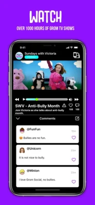 CREATE – videos, and use hilarious face filters or effects.WATCH - over 1,000 hours of Grom TV shows.DISCOVER - new videos and friends around the world, daily.CONNECT - with friends, celebrities, and athletes. SHARE - the best moments in life with friends.