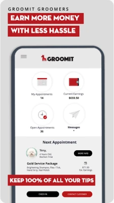 Join Groomit, the nations first in home pet grooming service. Apply on our website & once you’re approved, dog owners will send grooming requests your way. Do it full or part time, create your own schedule & you’ll get paid automatically into your bank account. Build your own customer business with Groomit. We provide you with grooming requests near you, supplies, insurance & team support. Don’t worry about anything.