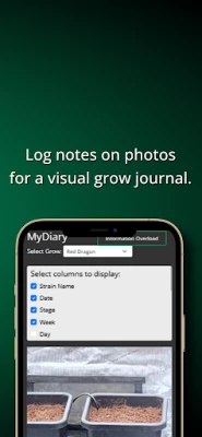 • Capture photos with data overlays showing grow metrics