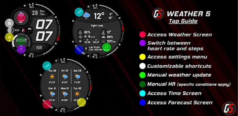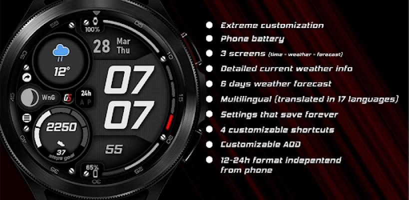GS Weather 5 is an advanced weather watch face for Wear OS smartwatches with unique features and extreme customization, fully translated into 17 languages.