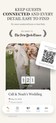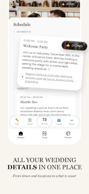 Guests RSVP directly in the app with custom questions like meal preferences and plus ones. Track responses in real time and easily download them to share with planners and vendors.
