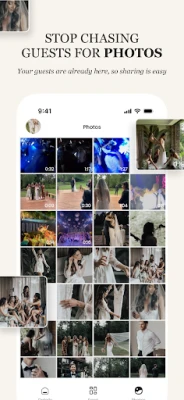 Capture moments you might miss. Guests upload photos and videos throughout the wedding weekend into one collective album. No QR codes. No expiring links.