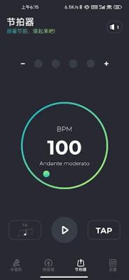• Provides a basic metronome with four sound options. The rotating dial adjusts tempo and can be switched to different time signatures. A speaker icon in the top right corner allows you to switch sounds.
