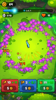 Defend the center, dodge enemies, and clear 10 intense waves per level.