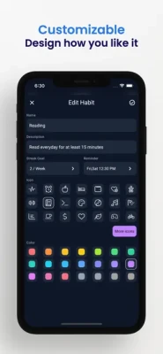 Add your habits you want to track in a fast and easy way. Provide a name, description, icon and color and you're good to go.