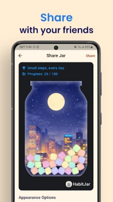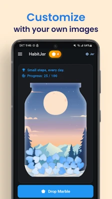 Personalize the app with themes, jar styles, marble colors, and custom images for your jar background.