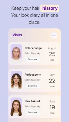 Turn ideas into great salon outcomes. Visits lets you keep a log for your hairdresser: add before/after photos, note cut names, color formulas, what you loved (or didn't), and set a reminder for your next appointment.
