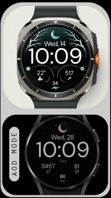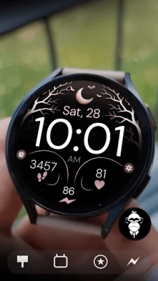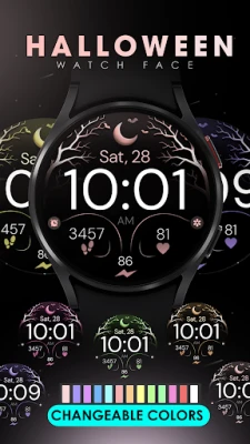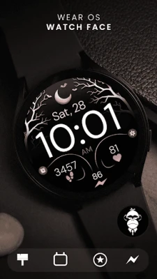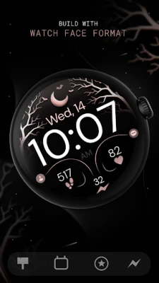 Created for Wear OS, this minimalist design combines with classic Halloween elements: a silhouetted tree, a moon, and bats fluttering in the background. Dominated by a chic rose gold hue, the color palette is customizable to match your festive spirit.