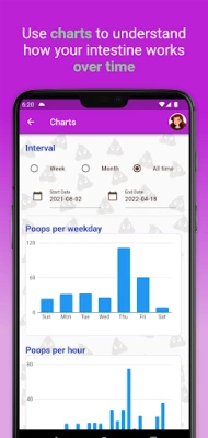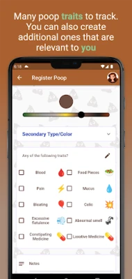 Use the Bristol scale to classify your poop, record information such as duration, quantity and color, as well as personalized notes and photos (don't worry, your privacy will always be respected).