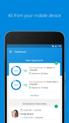 Because you work in hospitality, you're not always near your computer, which is why we created the Harri Hire™ mobile app. - Search our hospitality network for the type of talent your business needs and invite them to apply to your open positions - Communicate with applicants from anywhere - Keep track of who your are going to interview as well as the date and time all from your mobile device!