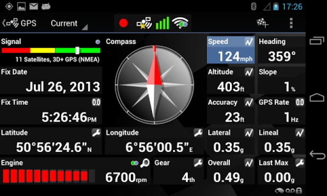 Want to show your drive to your friends? Recorded data can be analyzed using purpose designed views, making it easy to analyze and improve your driving performance. This includes several export formats including Google Earth.