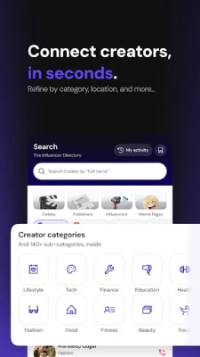 Explore 140+ creator categories including fashion, tech, food, fitness, beauty, travel, and more.