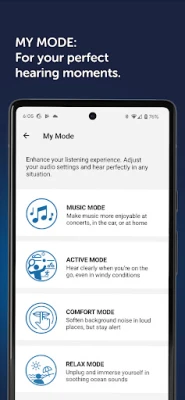 • MY MODE with four new functions making each hearing situatioon perfect: MUSIC MODE, ACTIVE MODE, COMFORT MODE and RELAX MODE.