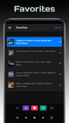 The interface is intuitive and simple – easily manage playback, add your favorite tracks to Favorites, and quickly find them the next time you open the app. You can also reorder tracks, enable repeat, and shuffle playback.