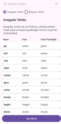 Learn Regular and Irregular Verbs in one place with well-organized lists and simple explanations.