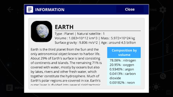 - Realistic Solar System Experience: Witness the beauty of our Solar System like never before with cutting-edge graphics that bring planets, moons, and asteroids to life. Explore detailed 3D models of Earth, Mars, Jupiter, and beyond, and gain up-to-date insights into each celestial body.