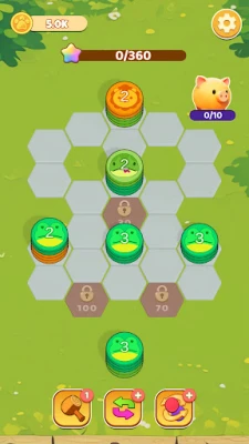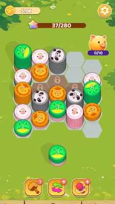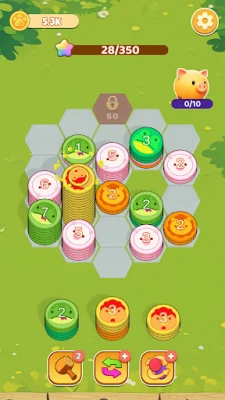Core Rules: Place animal stacks on hexagons. Adjacent identical animal stacks merge into one. Merged stacks auto-eliminate when reaching a threshold. Clear target to win. Earn coins by completing levels .
