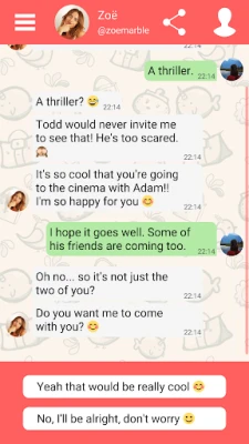 We are sure you will be pleasantly surprised by this chat story: Meet Adam, Zoe and Anna now. More than a simple fake boyfriend texting you app or virtual boyfriend app, you will live a real love story and choose the one of your friends too.