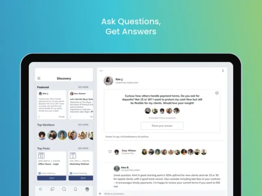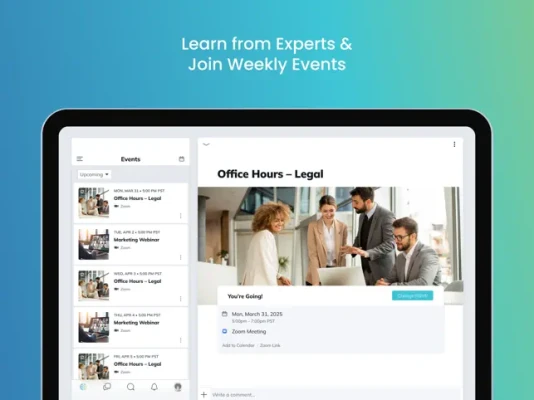 Connect with professionals in legal, accounting, marketing, and technology through live office hours, Q&A forums, and webinars. Earn 1-on-1 consultations through meaningful participation in the community.