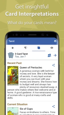 Looking for insight into a particular question or issue in your life? Tarot Cards can help explain your current situation and anticipate future events. In this app you get a free daily Three-Card Tarot Reading with detailed interpretations for each card.