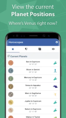 Start your day by checking out your Daily Horoscopes. You will get three each day. You can also view the current planetary positions.