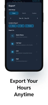 Choose what to include: gross income, net income, break details, and custom date ranges.