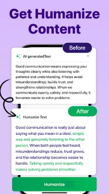 Paste your text, tap rewrite, and receive humanized content in seconds. The humanizer app is designed with a clean interface so you can focus on writing—not settings.