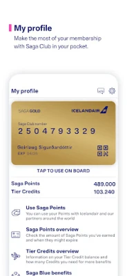 See your Saga Club and Tier Credit status, earn and use Saga Points, add Saga Club card to Wallet, or use your virtual Saga Club card in the app. You can also register Saga Points for past flights.