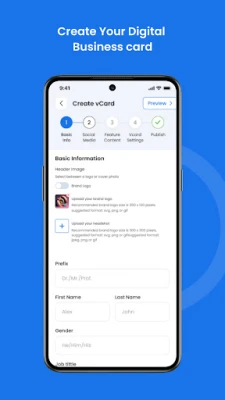 5. Add your Name, upload an Image, Add Designation, Address, and about info. Further add your Mobile number, email address, and social media handles in the next steps and yeah your digital business card is ready to be shared.