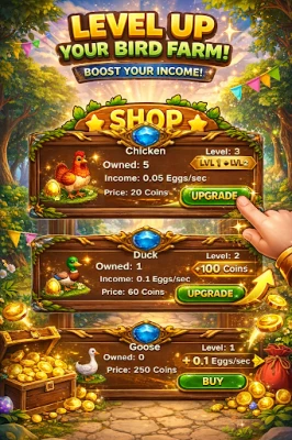 Start with a small farm and grow your empire in idle mode. Buy birds, collect eggs, upgrade production, and expand your business.
