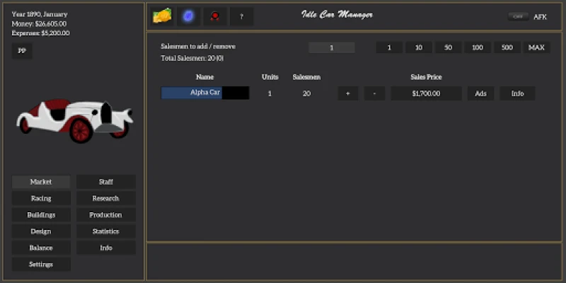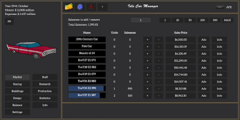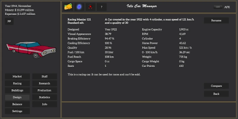 You can design, customize and research car parts to build your perfect car. But be careful, if you make mistakes your company might go bankrupt!