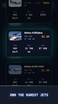 - Finally unlock the legendary flagships: the 747-8, the A380plus, and rare premium aircraft for the most ambitious operators. Collect exclusive variants like the Stealth 787, the Golden A380, the Concorde Neo, and the Zero-G Orbiter.
