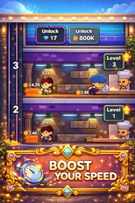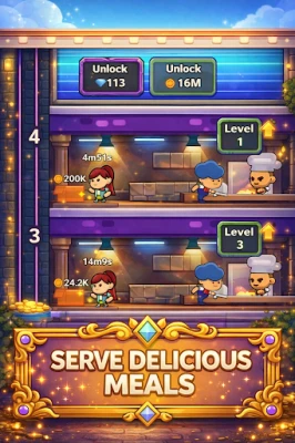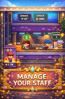 A restaurant is only as good as its team. Recruit skilled staff, including master chefs and efficient waiters. Identify the best managers to automate your operations. Each manager boosts specific stats like walking speed, cooking time, or capacity. Create the perfect automated workflow to maximize your revenue.