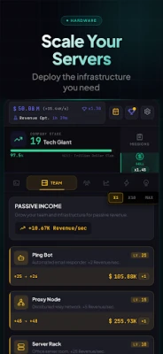 Deploy 8 passive income streams: Ping Bot, Proxy Node, Server Cluster, Neural Network Farm, Satellite Uplink, Underground Data Center, Orbital Station, and Self-Improving AI. Your team works 24/7 — earn up to 4 hours of offline income while you sleep (watch an ad for 100% efficiency, or claim 50% automatically).